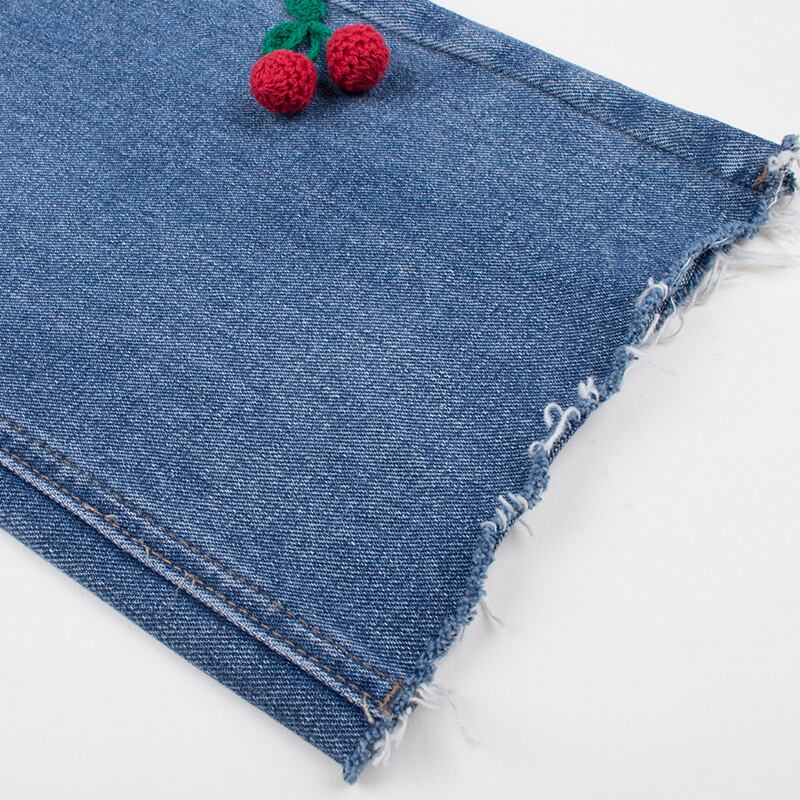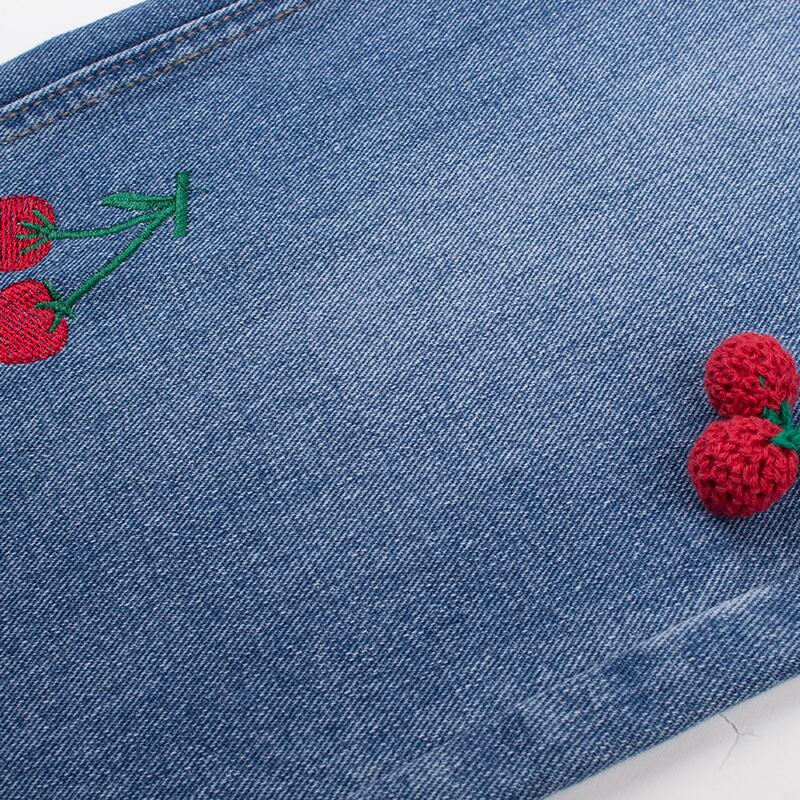 デニムにさくらんぼの刺繍とアップリケがつけられた、珍しいデザインのデニムパンツ。