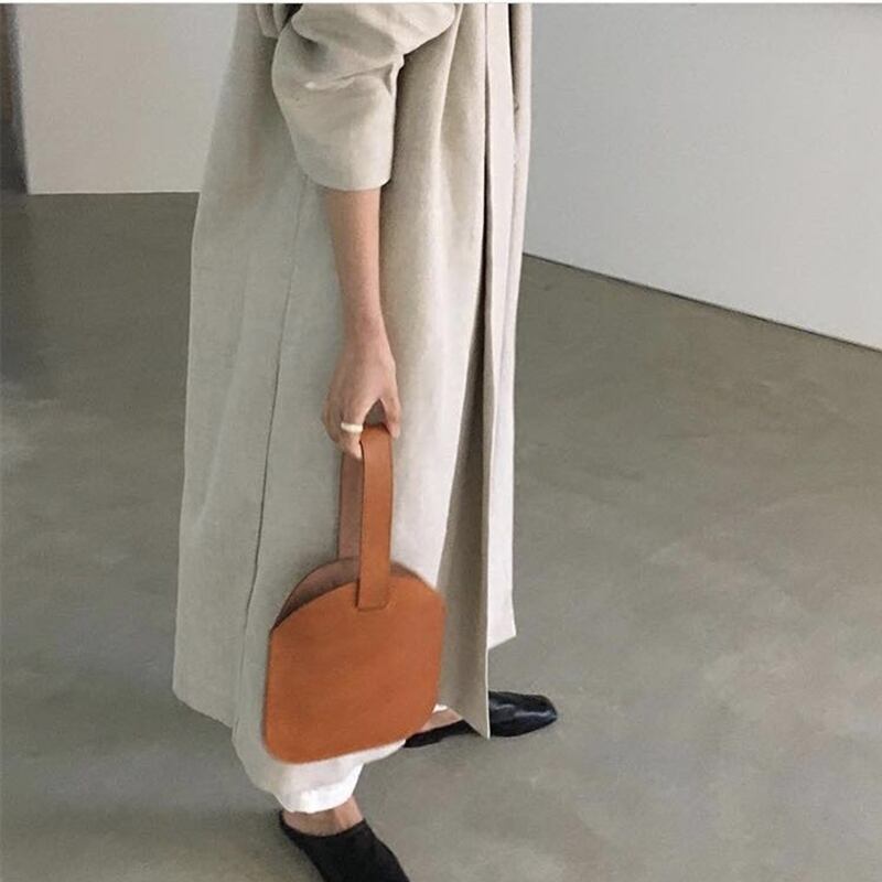 サークル型の袋口の柔らかなカットラインや珍しい持ち手など、ユニークでデザイン性の高いアイテムです。