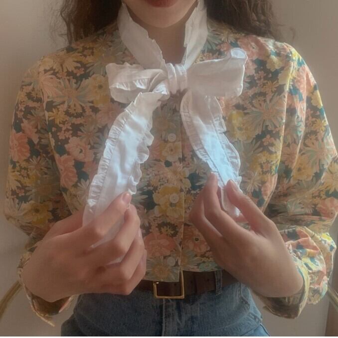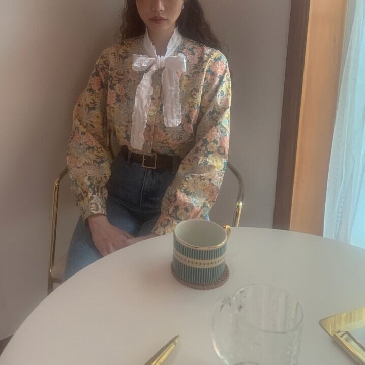 レースボウタイフラワープリントブラウス