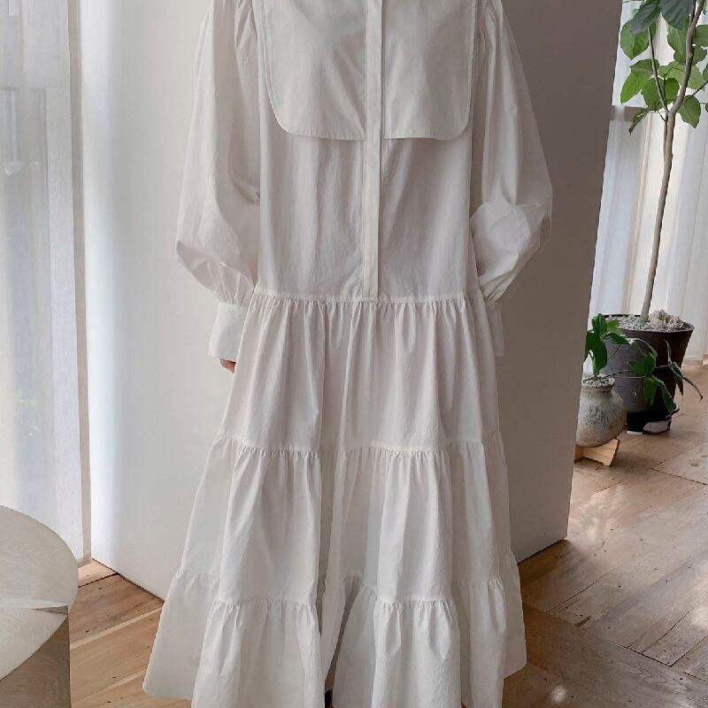 ビブカラーとボリュームのあるパフスリーブが特長的なロングスカート。ふわふわと揺れる華やかな雰囲気のティアードスカートが甘い雰囲気を演出します。