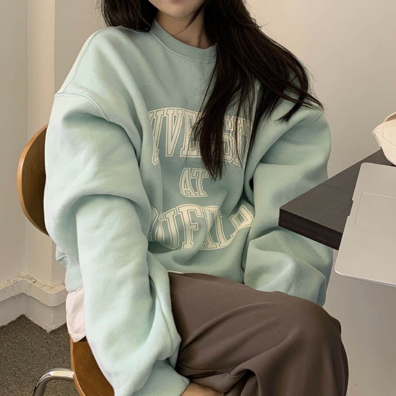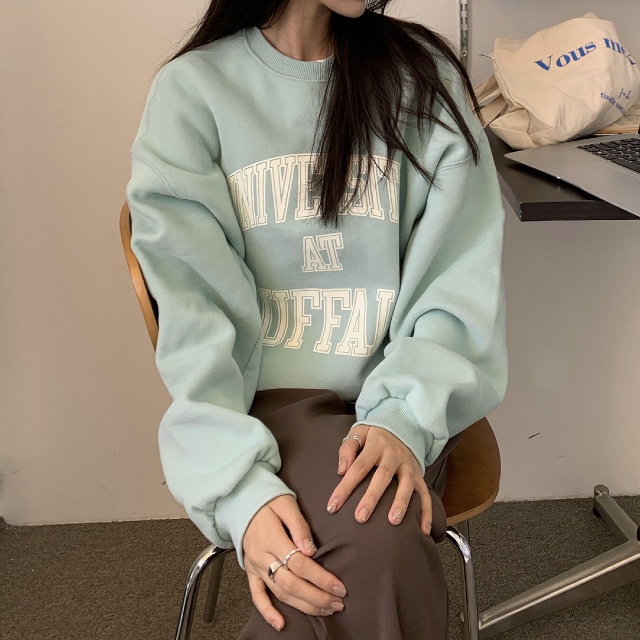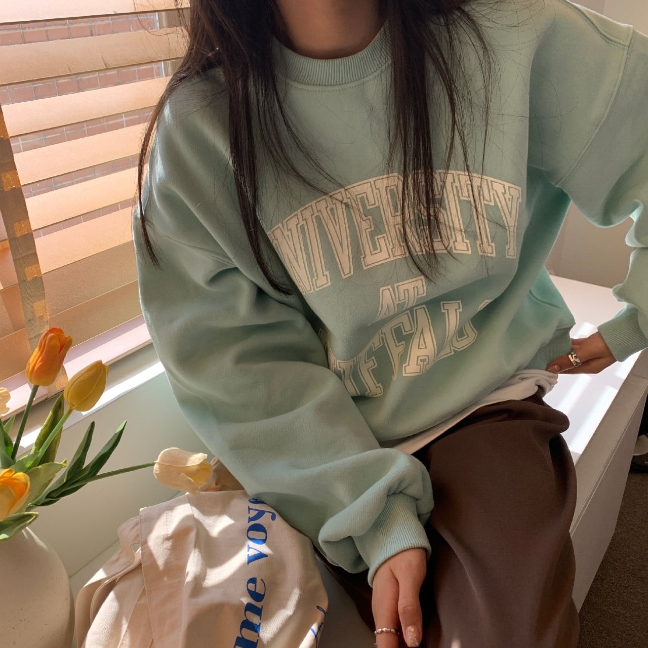 カレッジロゴが主役級の存在感のクルーネックののスウェット。