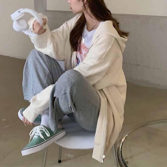 シンプルなデザインと、滑らかな肌触りのジップアップフーディースウェット。