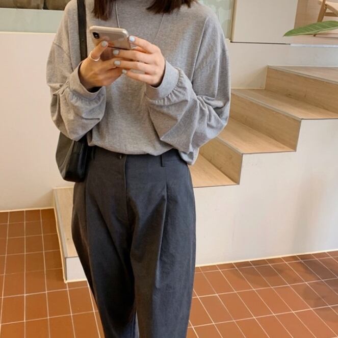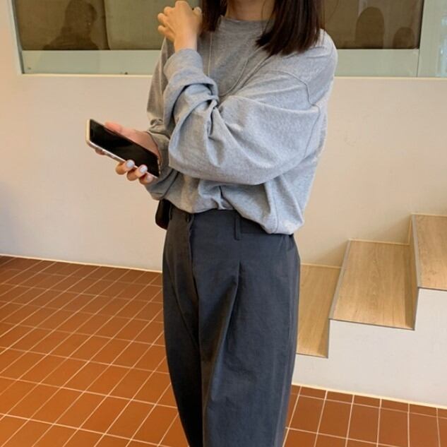 ルーズラウンドネックのグレーロングTシャツ。