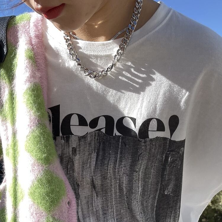 グランジ風なグラフィックがプリントされたホワイトTシャツ。