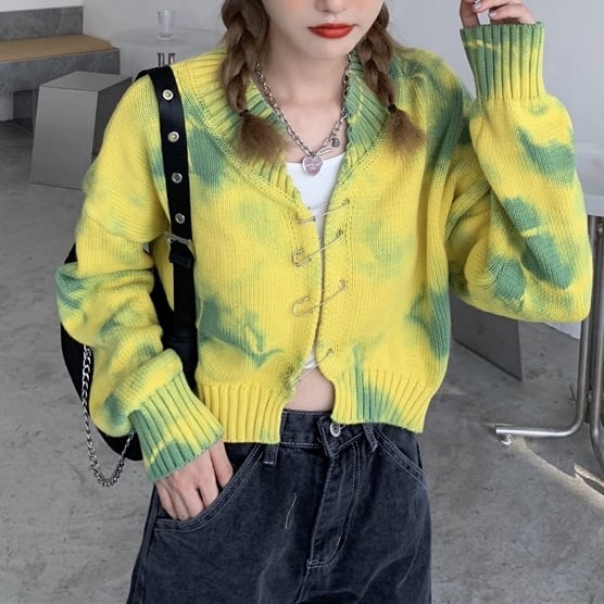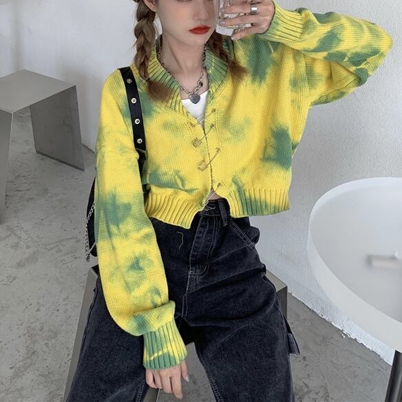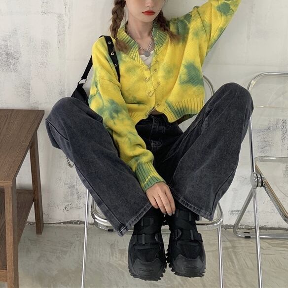明るいイエローベースのタイダイマーブルニットカーディガン。