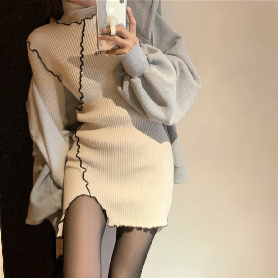 アシンメトリーでスリットが入ったヘムとブラックのメロウ刺繍ラインが特長のワンピース。