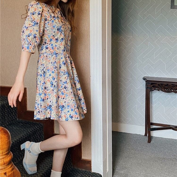 抽象画の絵画のようなフラワープリントがカフェなどのおでかけにもピッタリのミニワンピース。