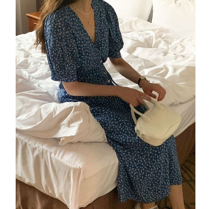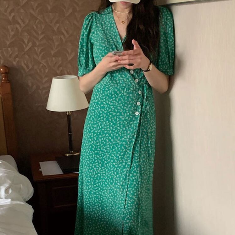 スモールフラワーVネックAラインワンピースドレス / 2カラー