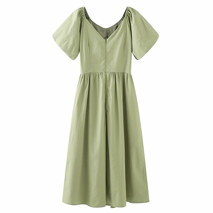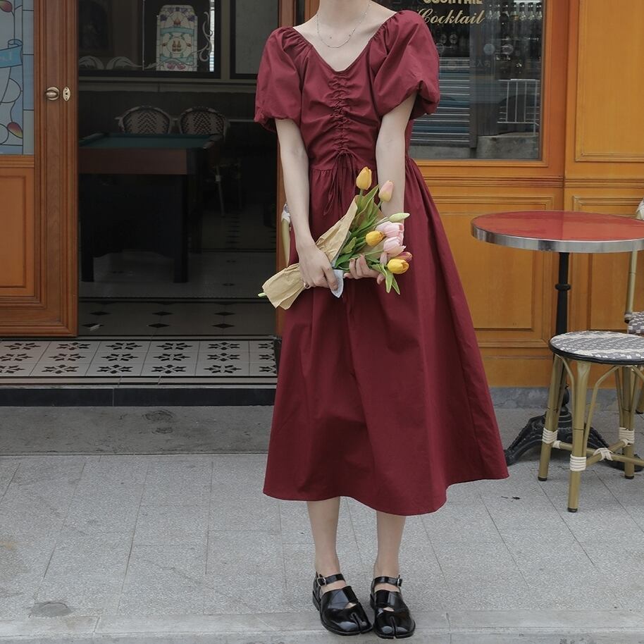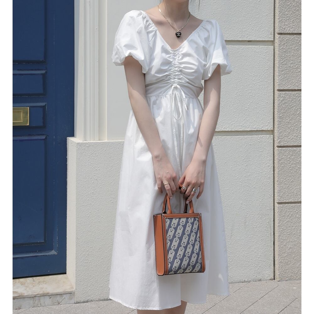 大きく開いたVネックと、クシュっと絞ったドロストが目を引くロマンティックなワンピース。