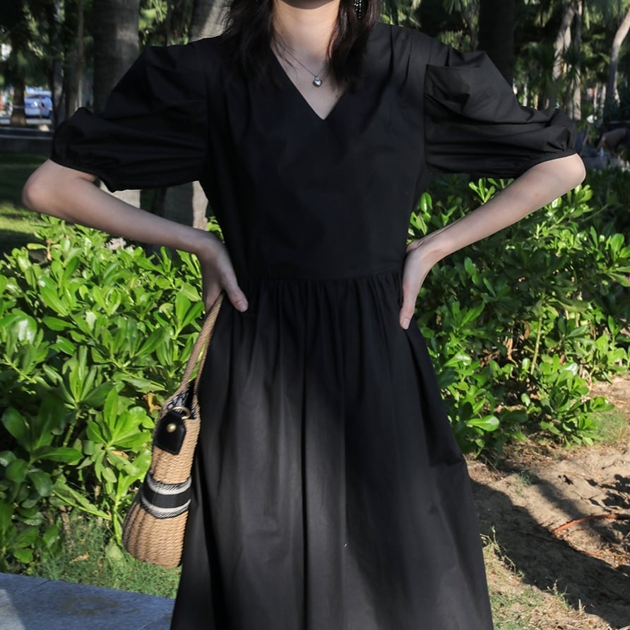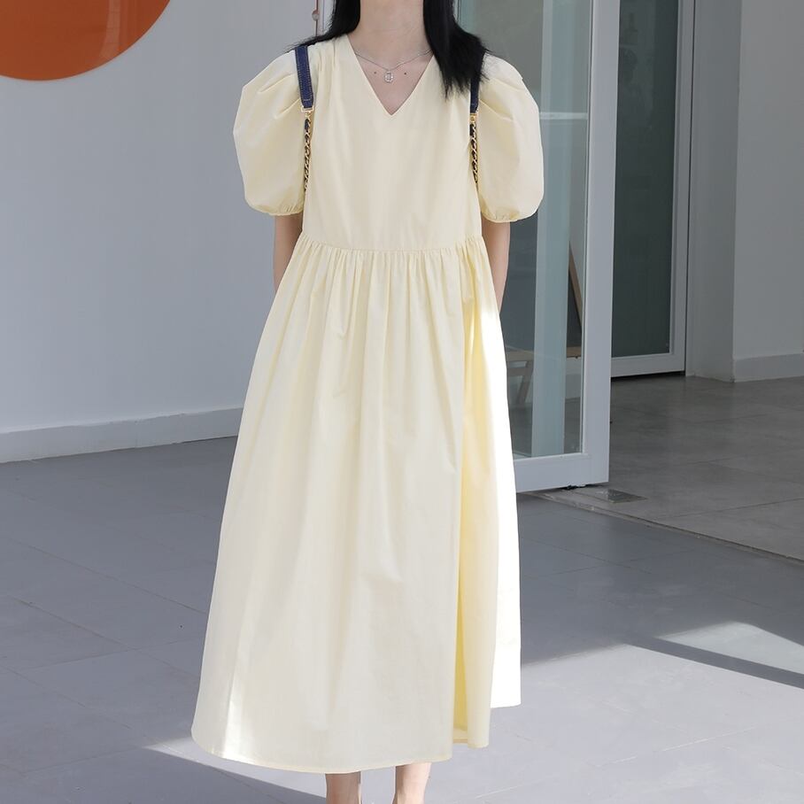 パフスリーブとウエストギャザーが大人可愛いVネックロングワンピース。