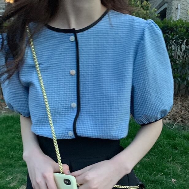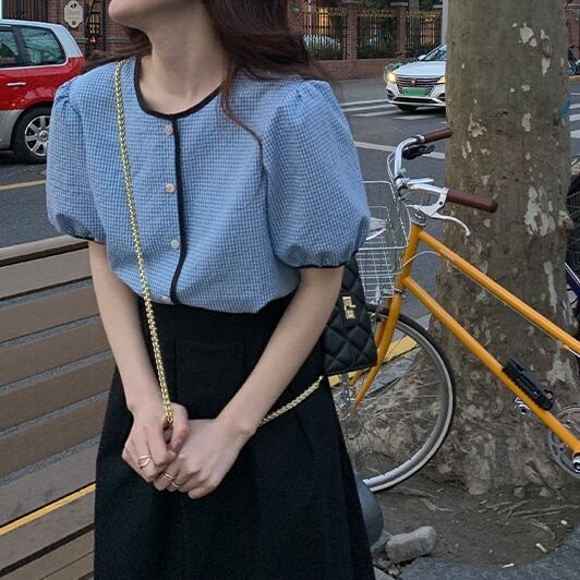 ふっくらと丸いパフスリーブでトレンド感をプラスした上品なチェックブラウス 。