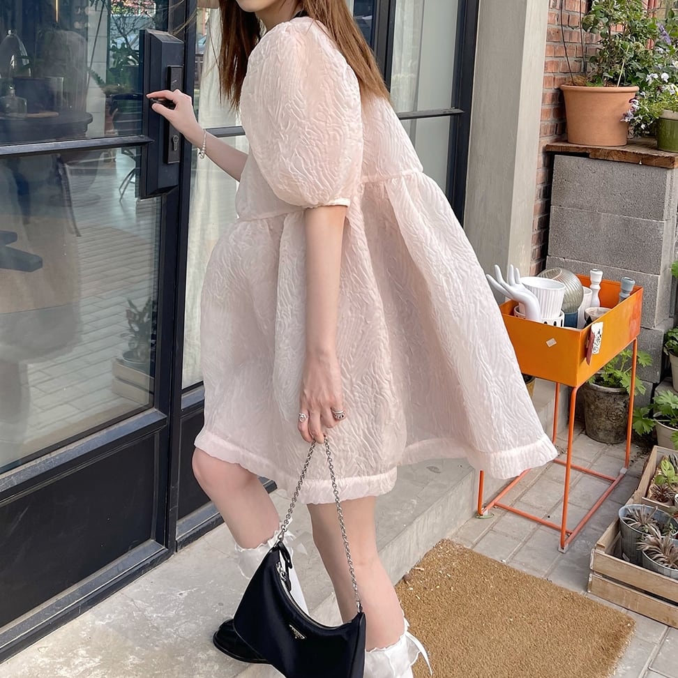 透け感とふわっとした質感がフェミニンなパフスリーブミニワンピース。