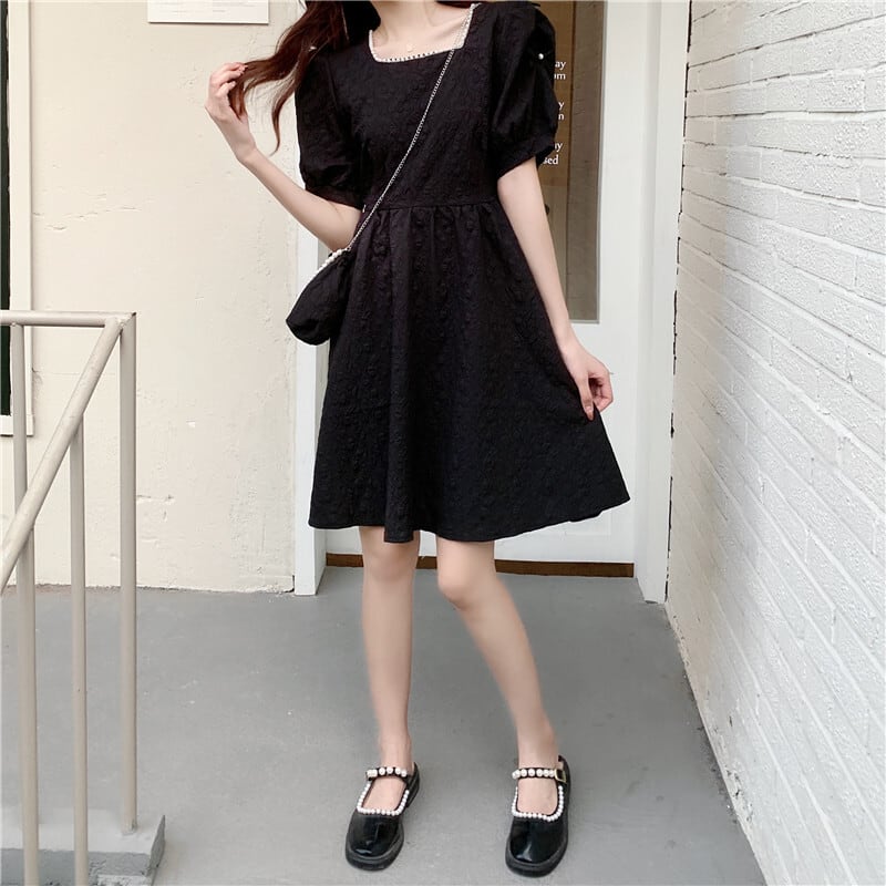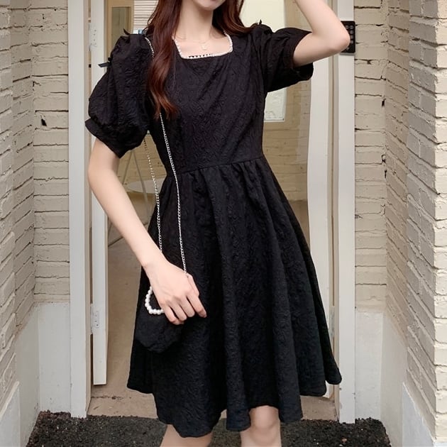 ふんわりとしたパフスリーブと、エンボス加工の生地がロマンティックなワンピース。
