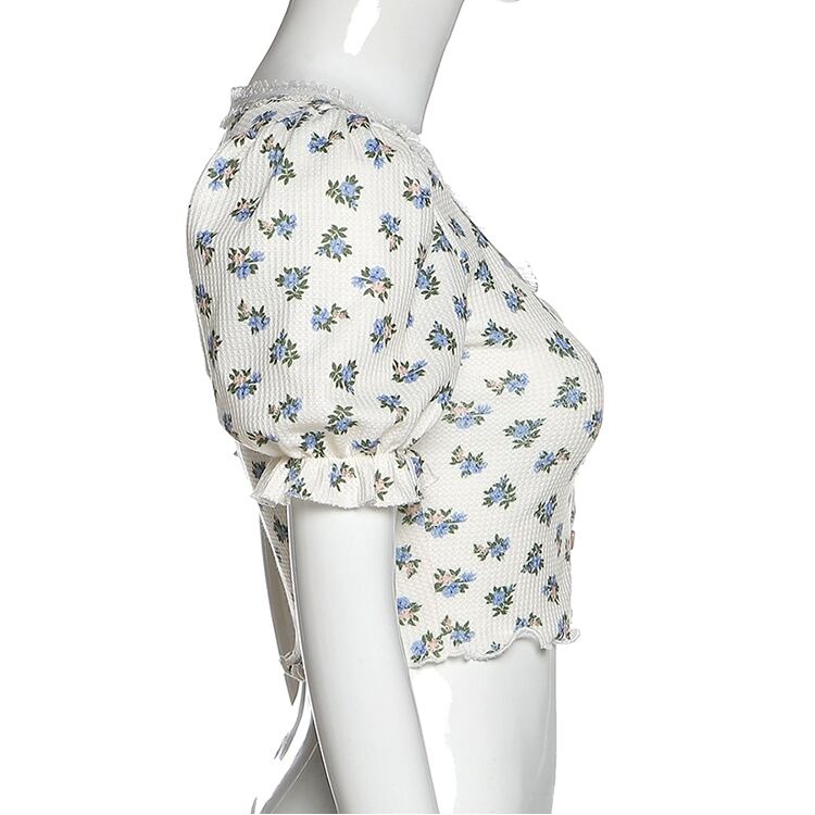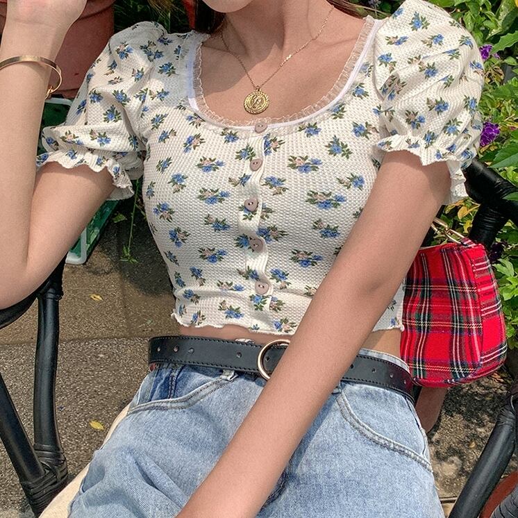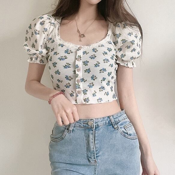 レースをあしらったスクエアネックとパフスリーブガーリーミックスなムードのクロップドTシャツ。