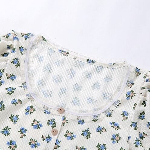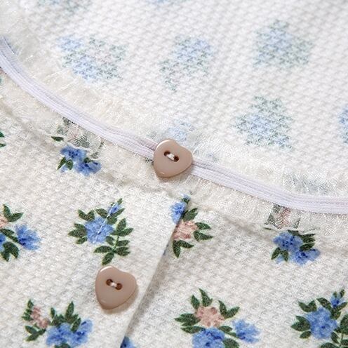 ガーリーなシルエットでも、白地にブルーの小花柄デザインとワッフル生地で、甘さを抑えたカジュアルな印象にしあがっています。