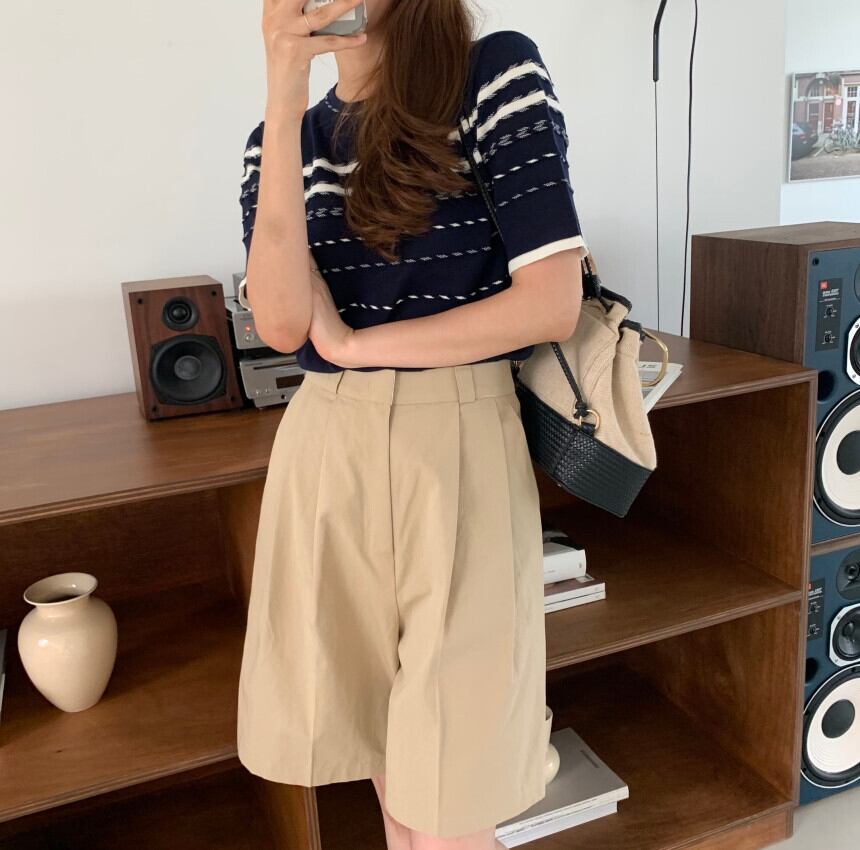 ラウンドネック3Dストライプサマーニットセーター / 2カラー