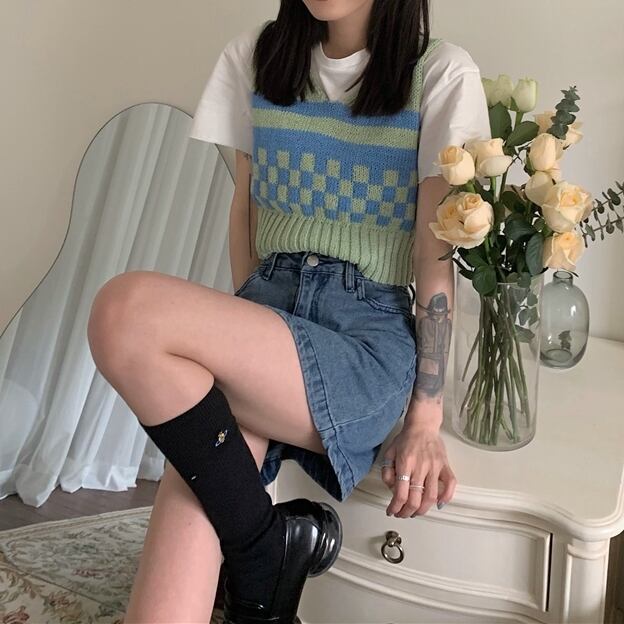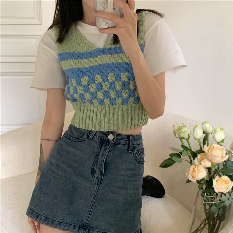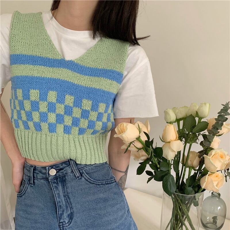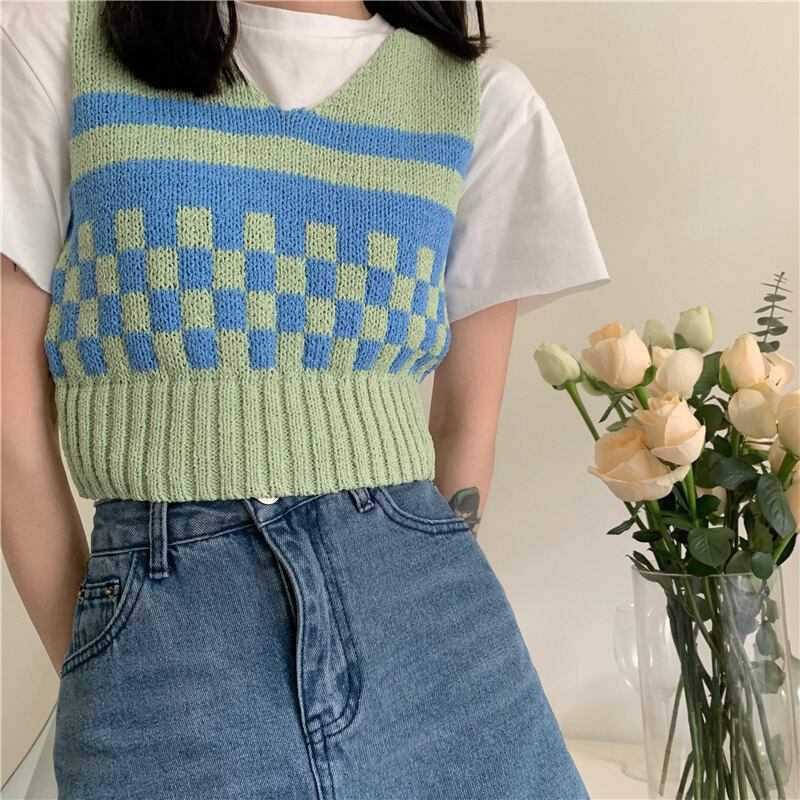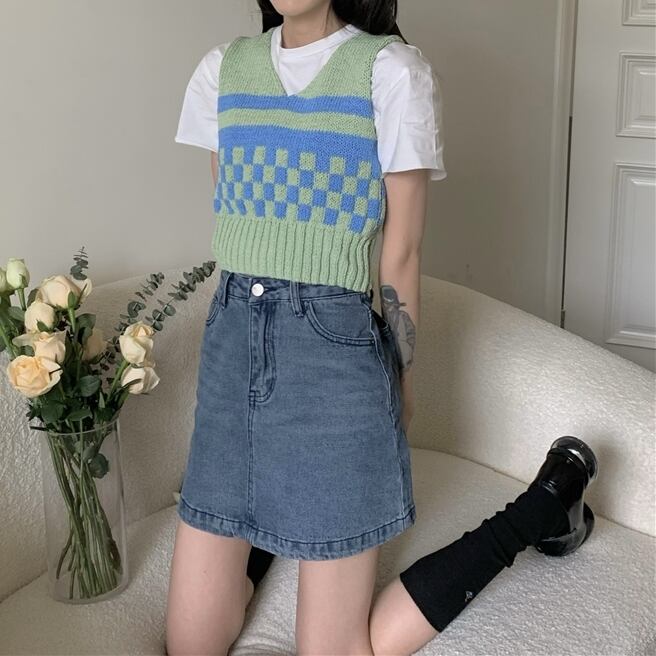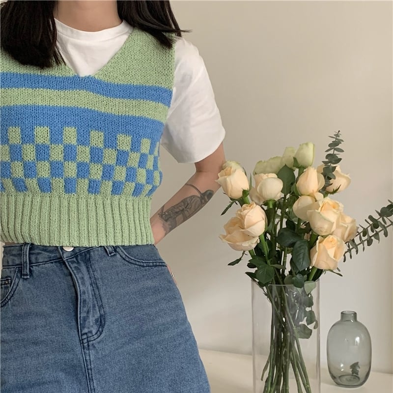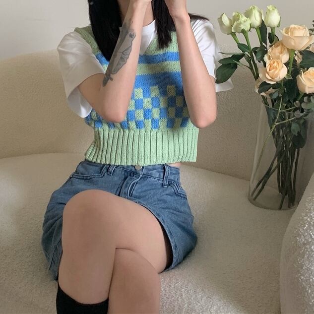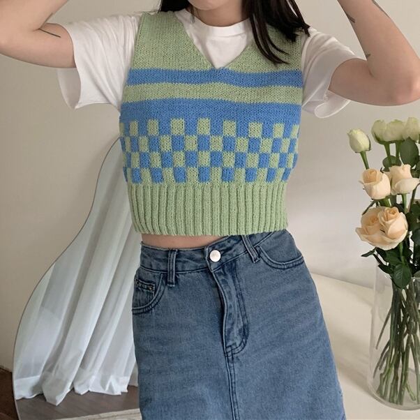 重ねるだけでコーデを華やかにするVネッククロップドニットベスト。