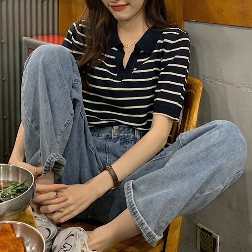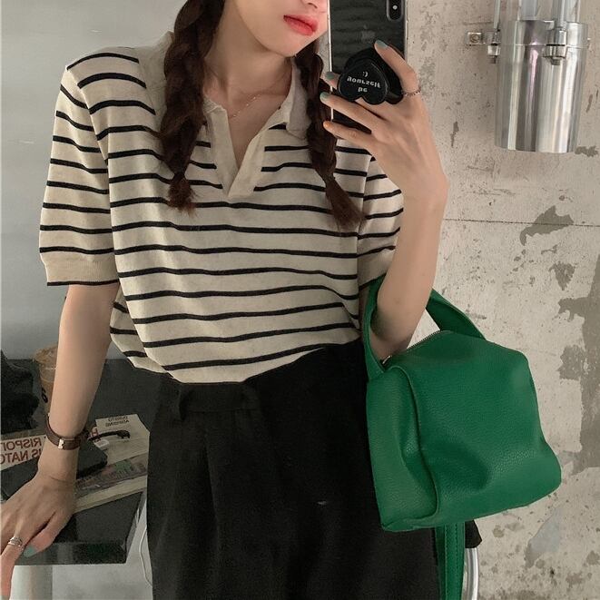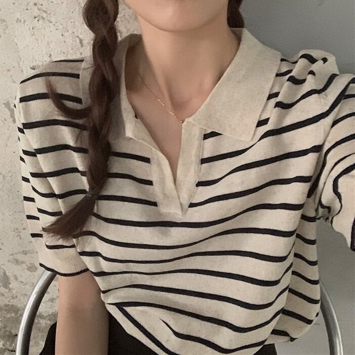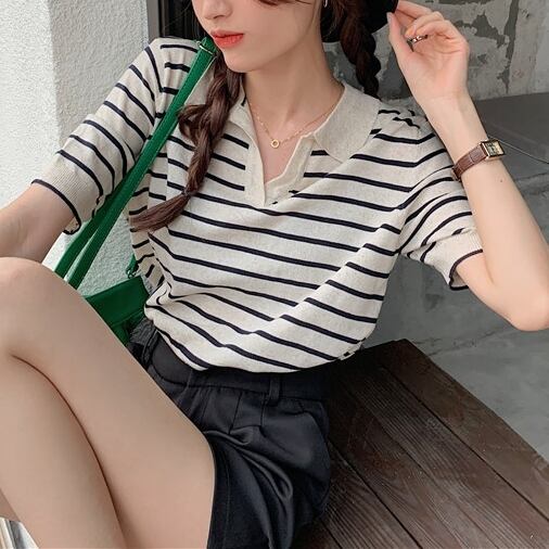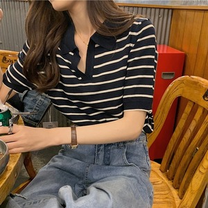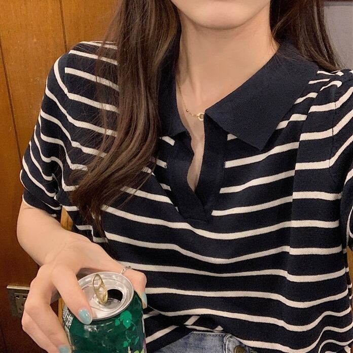 細めのボーダー柄が大人っぽくて爽やかな印象のポロシャツです。