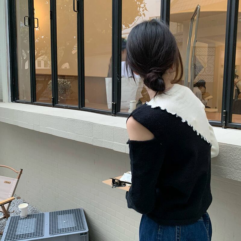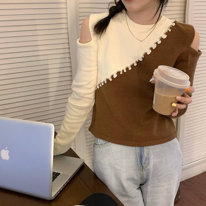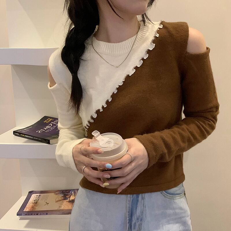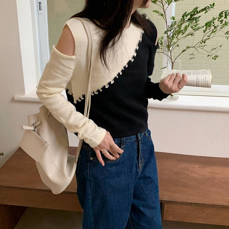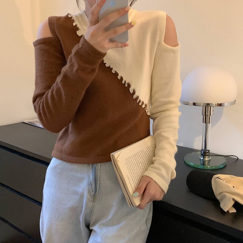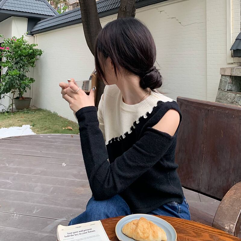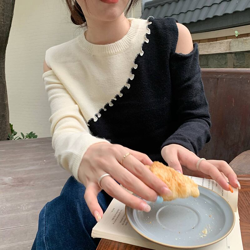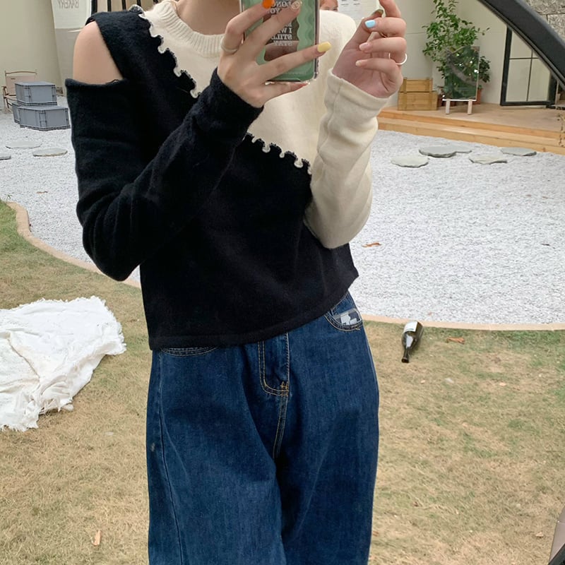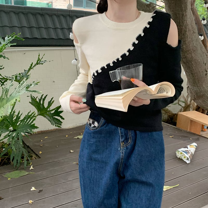 メリハリのあるバイカラーとヘルシーな肌見せのオープンショルダーニットプルオーバー。
