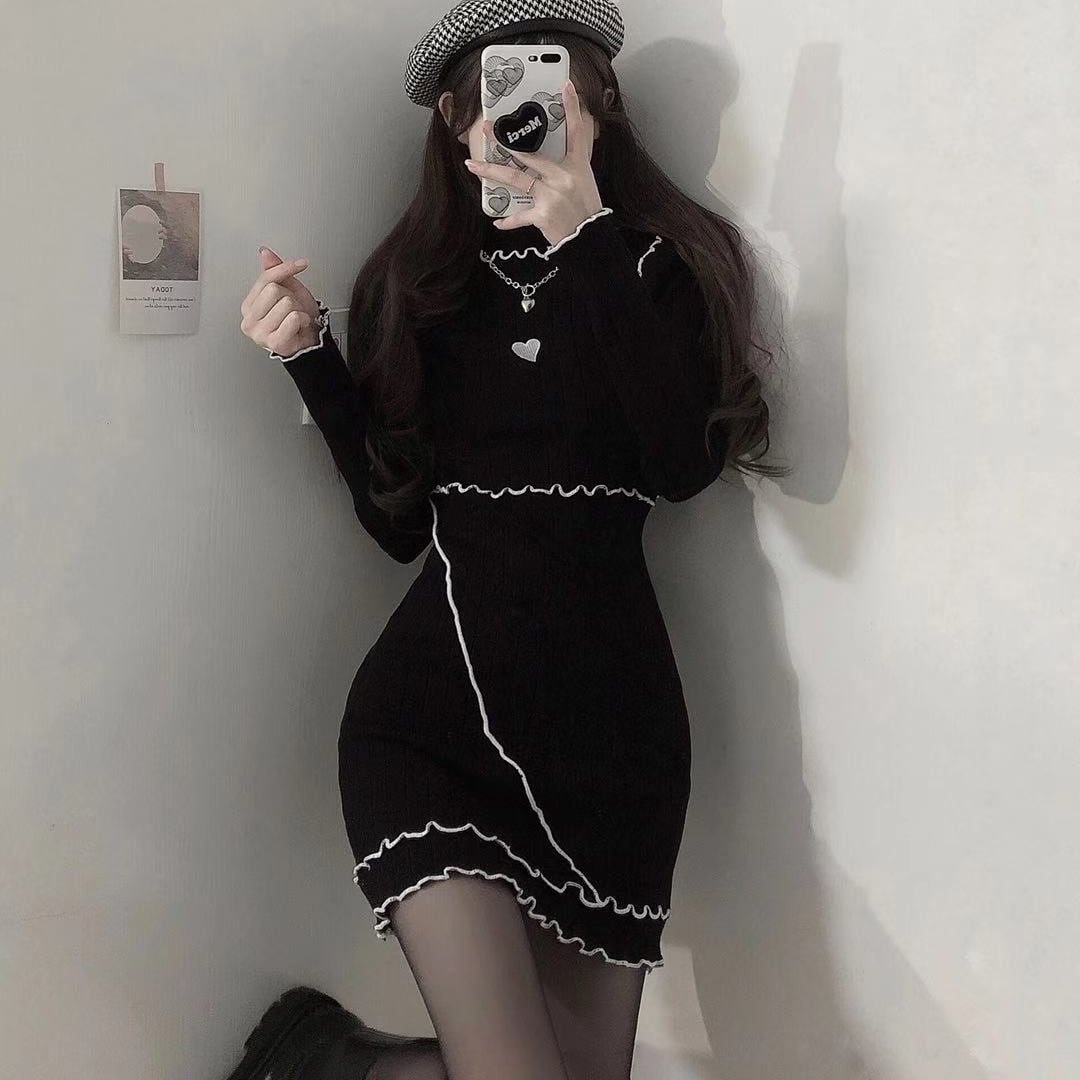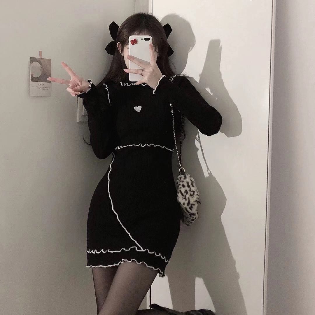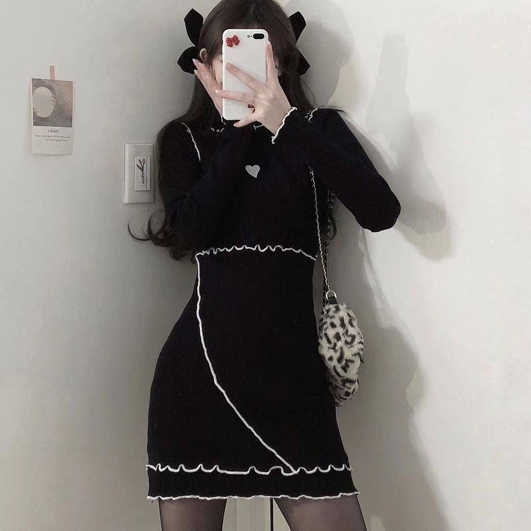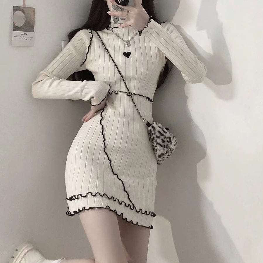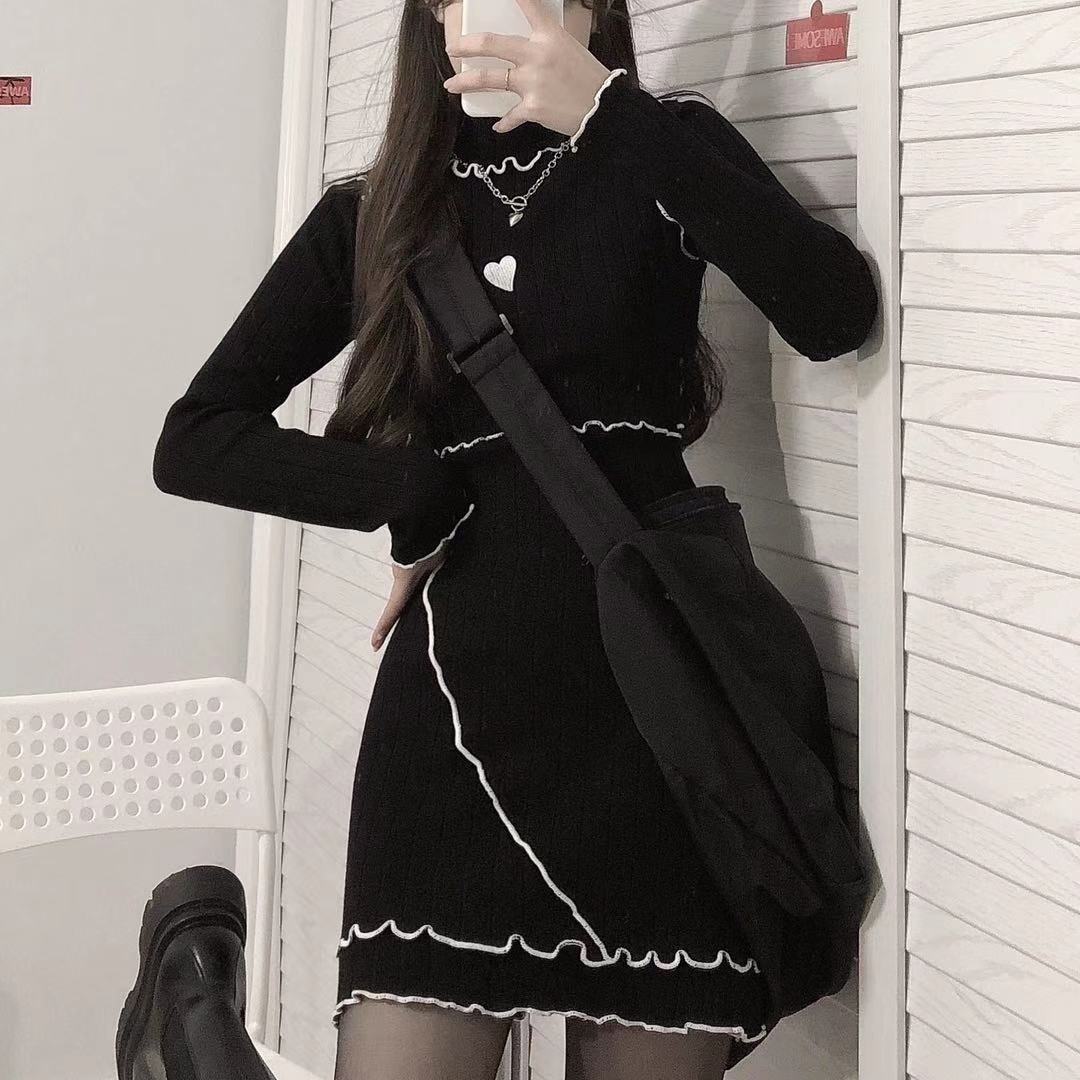 メロウ刺繍のラインが目を惹く、リブニットワンピースドレスです。
