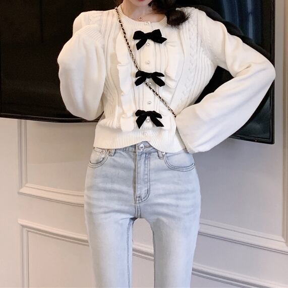 モノトーンコントラストのフロントリボンがガーリーシックなニットカーディガン♡