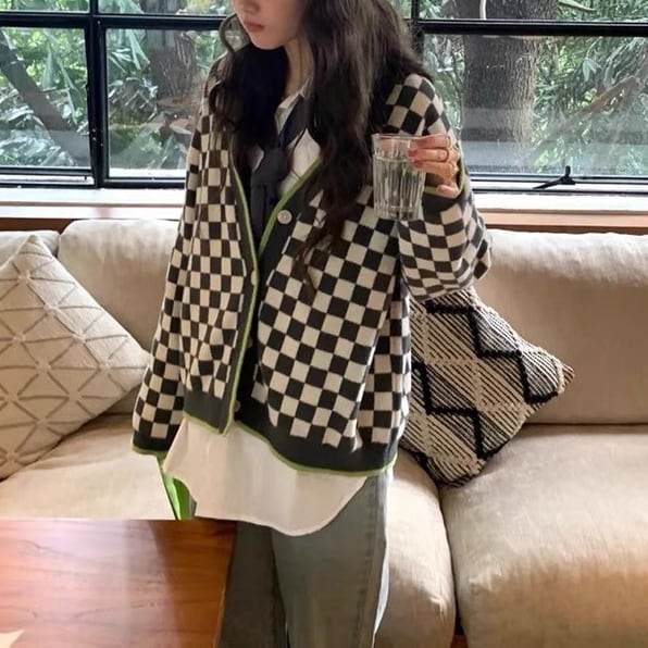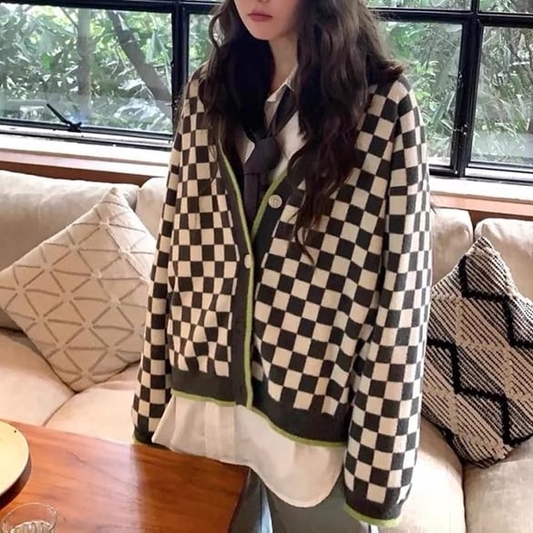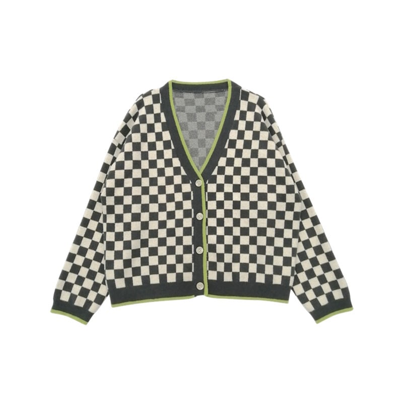 トレンドのブロックチェック柄にグリーンラインでアクセントをつけたアイキャッチーなニットカーディガン!